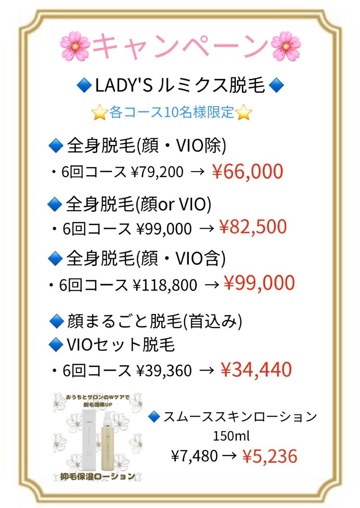 🌸キャンペーン🌸ルミクス脱毛でツルすべ肌をGETしょ~✨