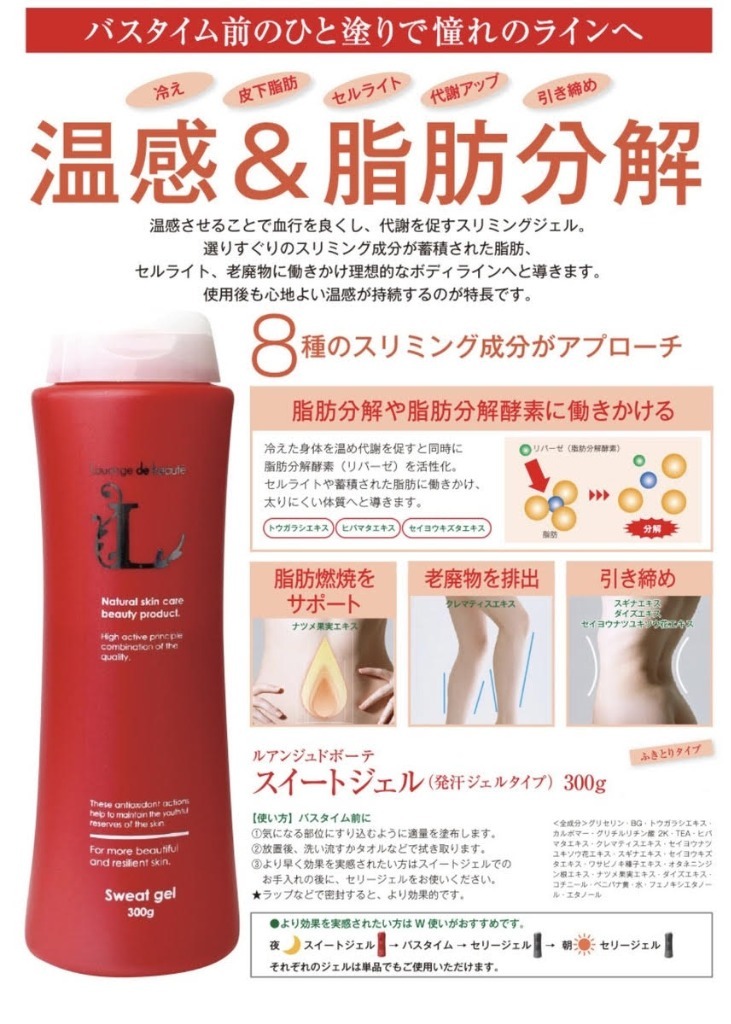 温感マッサージジェルが気になる部分にアプローチして発汗や脂肪分解をサポートします!