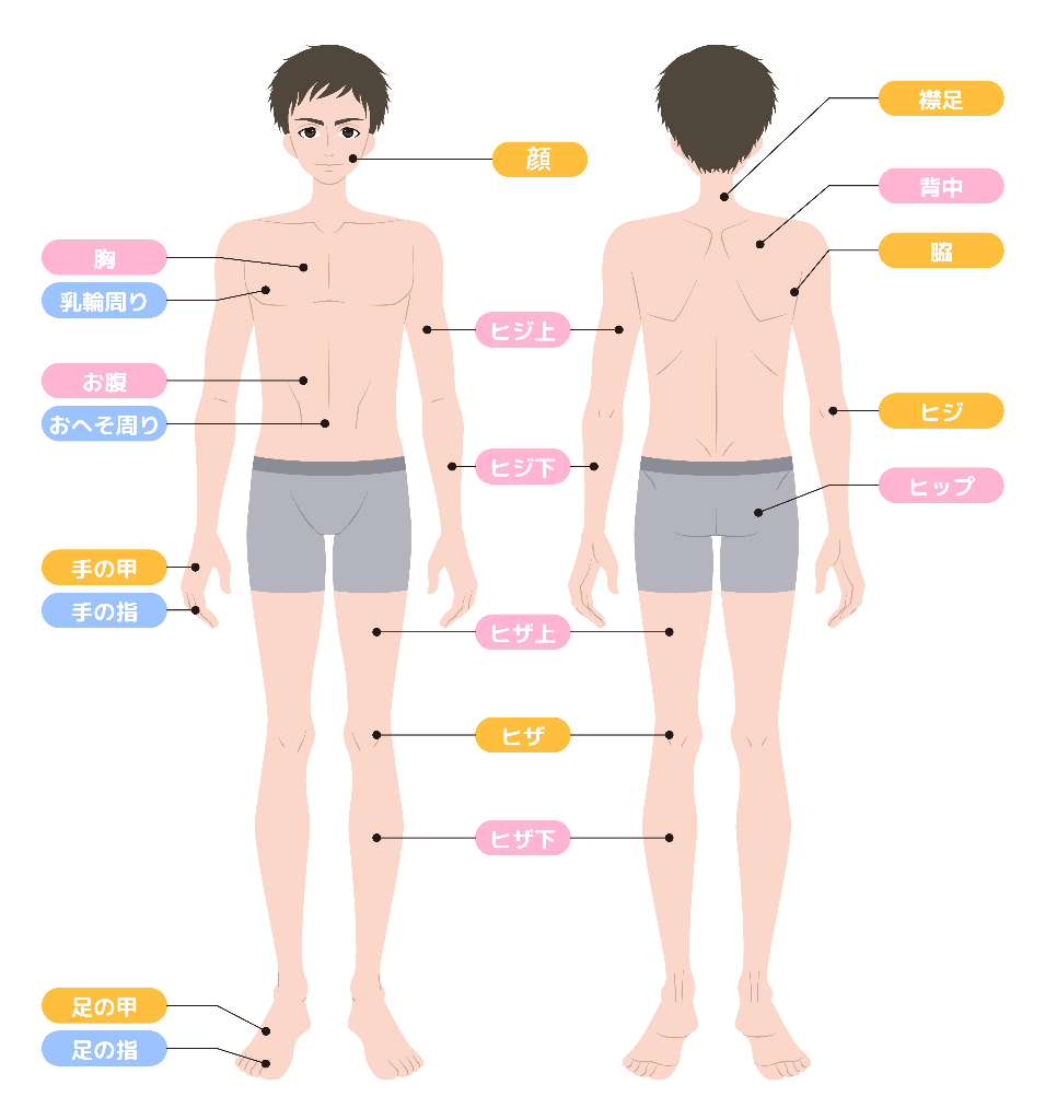 両ひざ上・両ひざ下・背中上(首の付け根から肩甲骨まで)・背中下(肩甲骨から腰まで)・胸(鎖骨下からバストまで)・腹部(バスト下からへそ下まで)